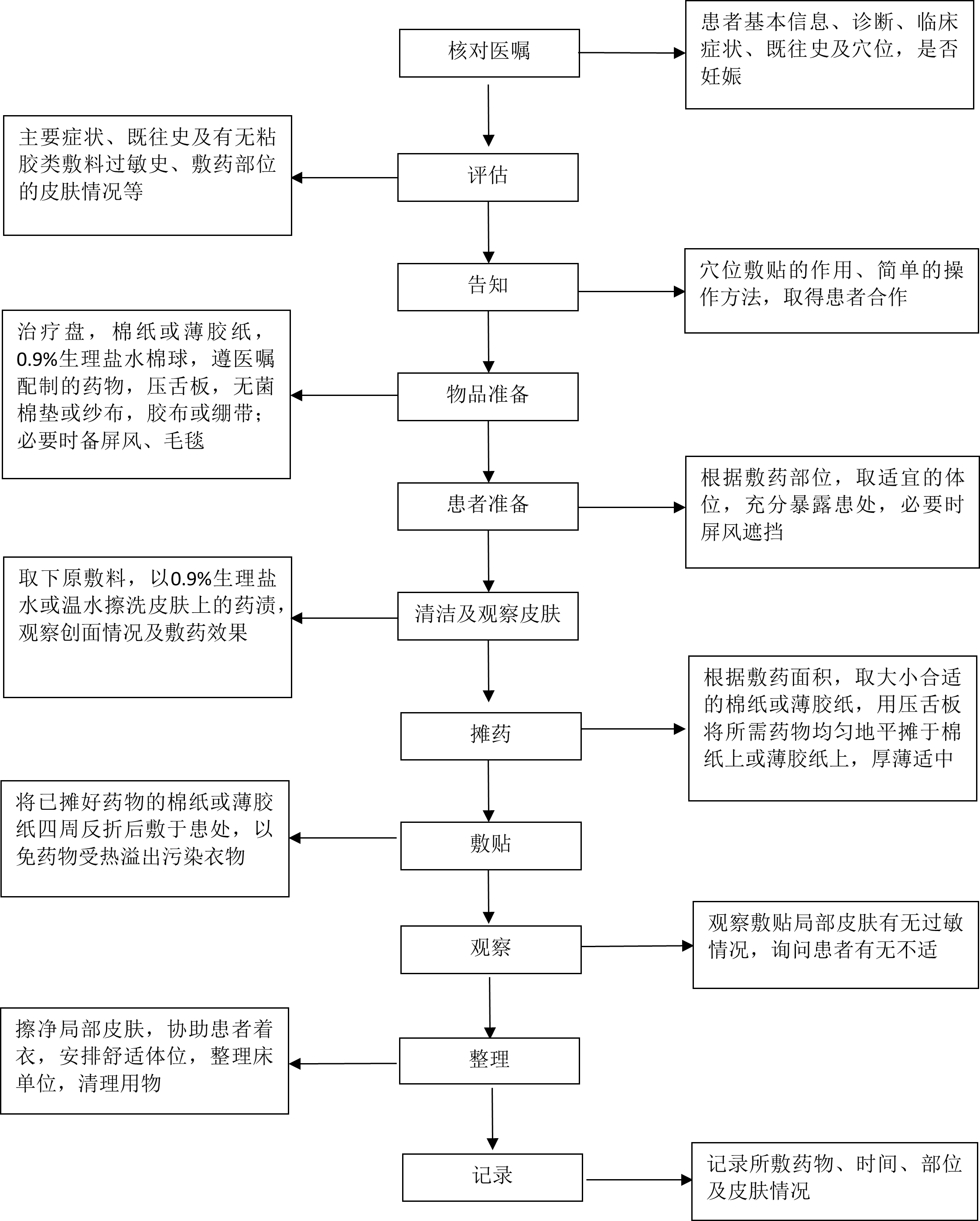 穴位敷贴技术是将药物制成一定剂型,敷贴到人体穴位,通过刺激穴位,激发经气,达到通经活络、清热解毒、活血化瘀、消肿止痛、行气消痞、扶正强身作用的一种操作方法。 一、适用范围 适用于恶性肿瘤、各种疮疡及跌打损伤等疾病引起的疼痛;消化系统疾病引起的腹胀、腹泻、便秘;呼吸系统疾病引起的咳喘等症状。 二、评估 1.病室环境,温度适宜。 2.主要症状、既往史、药物及敷料过敏史,是否妊娠。 3.敷药部位的皮肤情况。 三、告知 1.出现皮肤微红为正常现象,若出现皮肤瘙痒、丘疹、水泡等,应立即告知护士。 2.穴位敷贴时间一般为6~8小时。可根据病情、年龄、药物、季节调整时间,小儿酌减。 3.若出现敷料松动或脱落及时告知护士。 4.局部贴药后可出现药物颜色、油渍等污染衣物。 四、物品准备 治疗盘,棉纸或薄胶纸,遵医嘱配制的药物,压舌板,无菌棉垫或纱布,胶布或绷带,0.9%生理盐水棉球;必要时备屏风、毛毯。 五、基本操作方法 1.核对医嘱,评估患者,做好解释,注意保暖。 2.备齐用物,携至床旁。根据敷药部位,协助患者取适宜的体位,充分暴露患处,必要时屏风遮挡患者。 3.更换敷料,以0.9%生理盐水或温水擦洗皮肤上的药渍,观察创面情况及敷药效果。 4.根据敷药面积,取大小合适的棉纸或薄胶纸,用压舌板将所需药物均匀地涂抹于棉纸上或薄胶纸上,厚薄适中。 5.将药物敷贴于穴位上,做好固定。为避免药物受热溢出污染衣物,可加敷料或棉垫覆盖。以胶布或绷带固定,松紧适宜。 6.温度以患者耐受为宜。 7.观察患者局部皮肤,询问有无不适感。 8.操作完毕后擦净局部皮肤,协助患者着衣,安排舒适体位。 六、注意事项 1.孕妇的脐部、腹部、腰骶部及某些敏感穴位,如合谷、三阴交等处都不宜敷贴,以免局部刺激引起流产。 2.药物应均匀涂抹于绵纸中央,厚薄一般以0.2~0.5cm为宜,覆盖敷料大小适宜。 3.敷贴部位应交替使用,不宜单个部位连续敷贴。 4.除拔毒膏外,患处有红肿及溃烂时不宜敷贴药物,以免发生化脓性感染。 5.对于残留在皮肤上的药物不宜采用肥皂或刺激性物品擦洗。 6.使用敷药后,如出现红疹、瘙痒、水泡等过敏现象,应暂停使用,报告医师,配合处理。 附:穴位敷贴技术操作流程图 (湖南中医药大学护理学院) 附: 穴位敷贴技术操作流程图