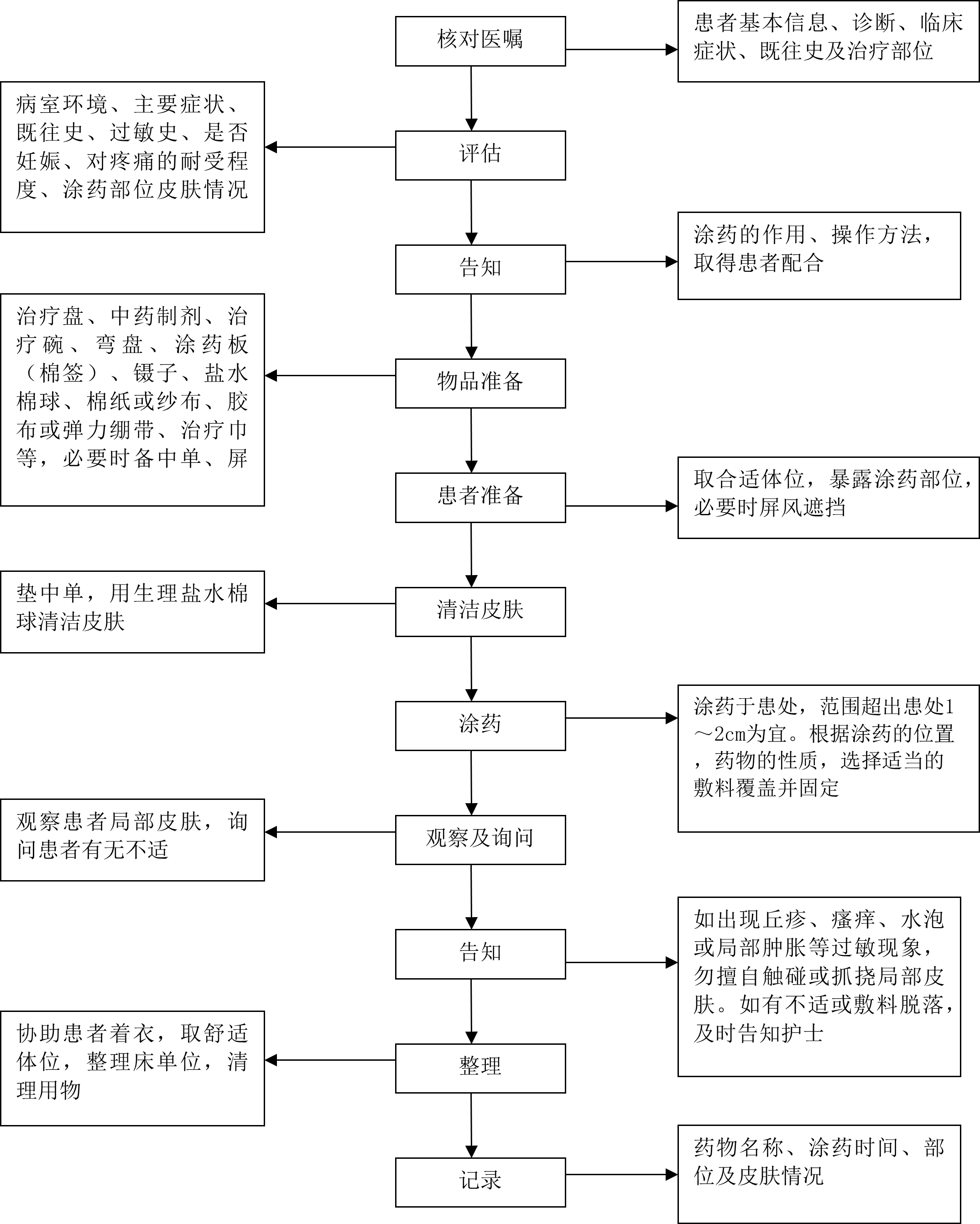 中药涂药技术是将中药制成水剂、酊剂、油剂、膏剂等剂型,涂抹于患处或涂抹于纱布外敷于患处,达到祛风除湿、解毒消肿、止痒镇痛的一种操作方法。 一、适用范围 适用于跌打损伤、烫伤、烧伤、疖痈、静脉炎等。 二、评估 1.病室环境,温度适宜。 2.主要症状、既往史、药物过敏史、是否妊娠。 3.对疼痛的耐受程度。 4.涂药部位的皮肤情况。 三、告知 1.涂药后如出现痛、痒、胀等不适,应及时告知护士,勿擅自触碰或抓挠局部皮肤。 2.涂药后若敷料脱落或包扎松紧不适宜,应及时告知护士。 3.涂药后可能出现药物颜色、油渍等污染衣物的情况。 4.中药可致皮肤着色,数日后可自行消退。 四、物品准备 治疗盘、中药制剂、治疗碗、弯盘、涂药板(棉签)、镊子、盐水棉球、纱布或棉纸、胶布或弹力绷带、治疗巾等,必要时备中单、屏风、大毛巾。 五、基本操作方法 1.核对医嘱,评估患者,做好解释,调节病室温度。 2.备齐用物,携至床旁。根据涂药部位,取合理体位,暴露涂药部位,必要时屏风遮挡。 3.患处铺治疗巾用生理盐水棉球清洁皮肤并观察局部皮肤情况。 4.将中药制剂均匀涂抹于患处或涂抹于纱布外敷于患处,范围超出患处1~2cm为宜。 5.各类剂型用法 (1)混悬液先摇匀后再用棉签涂抹。 (2)水、酊剂类药物用镊子夹棉球蘸取药物涂擦,干湿度适宜,以不滴水为度,涂药均匀。 (3)膏状类药物用棉签或涂药板取药涂擦,涂药厚薄均匀,以2~3mm为宜。 (4)霜剂应用手掌或手指反复擦抹,使之渗入肌肤。 (5)对初起有脓头或成脓阶段的肿疡,脓头部位不宜涂药。 (6)乳痈涂药时,在敷料上剪一缺口,使乳头露出,利于乳汁的排空。 6.根据涂药的位置、药物的性质,必要时选择适当的敷料覆盖并固定。 7.涂药过程中随时询问患者有无不适。 8.操作完毕,协助患者着衣,安排舒适体位。 六、注意事项 1.婴幼儿颜面部、过敏体质者及妊娠患者慎用。 2.涂药前需清洁局部皮肤。 3.涂药不宜过厚以防毛孔闭塞。 4.涂药后,观察局部及全身的情况,如出现丘疹、瘙痒、水泡或局部肿胀等过敏现象,停止用药,将药物擦洗干净并报告医生,配合处理。 5.患处若有敷料,不可强行撕脱,可用生理盐水棉球沾湿敷料后再揭,并擦去药迹。 附:中药涂药技术操作流程图 (安徽省中医院) 附: 中药涂药技术操作流程图 中药熏蒸技术