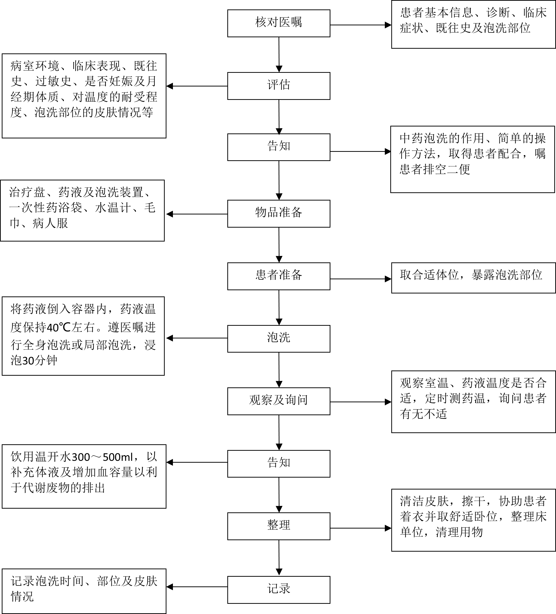 中药泡洗技术中药泡洗技术是借助泡洗时洗液的温热之力及药物本身的功效,浸洗全身或局部皮肤,达到活血、消肿、止痛、祛瘀生新等作用的一种操作方法。 一、适用范围 适用于外感发热、失眠、便秘、皮肤感染及中风恢复期的手足肿胀等症状。 二、评估 1.病室环境,温度适宜。 2.主要症状、既往史、过敏史、是否妊娠或处于月经期。 3.体质、对温度的耐受程度。 4.泡洗部位皮肤情况。 三、告知 1.餐前餐后30分钟内不宜进行全身泡浴。 2.全身泡洗时水位应在膈肌以下,以微微汗出为宜,如出现心慌等不适症状,及时告知护士。 3.中药泡洗时间30分钟为宜。 4.泡洗过程中,应饮用温开水300~500ml,小儿及老年人酌减,以补充体液及增加血容量以利于代谢废物的排出。有严重心肺及肝肾疾病患者饮水不宜超过150ml。 四、物品准备 治疗盘、药液及泡洗装置、一次性药浴袋、水温计、毛巾、病服。 五、基本操作方法 1.核对医嘱,评估患者,做好解释,调节室内温度。嘱患者排空二便。 2.备齐用物,携至床旁。根据泡洗的部位,协助患者取合理、舒适体位,注意保暖。 3.将一次性药浴袋套入泡洗装置内。 4.常用泡洗法: (1)全身泡洗技术: 将药液注入泡洗装置内,药液温度保持40℃左右,水位在患者膈肌以下,全身浸泡30分钟。 (2)局部泡洗技术: 将40℃左右的药液注入盛药容器内,将浸洗部位浸泡于药液中,浸泡30分钟。 5.观察患者的反应,若感到不适,应立即停止,协助患者卧床休息。 6.操作完毕,清洁局部皮肤,协助着衣,安置舒适体位。 六、注意事项 1.心肺功能障碍,出血性疾病患者禁用。糖尿病、心脑血管病患者及妇女月经期间慎用。 2.防烫伤,糖尿病、足部皲裂患者的泡洗温度适当降低。 3.泡洗过程中,应关闭门窗,避免患者感受风寒。 4.泡洗过程中护士应加强巡视,注意观察患者的面色、呼吸、汗出等情况,出现头晕、心慌等异常症状,停止泡洗,报告医师。 附:中药泡洗技术操作流程图 (上海中医药大学附属龙华医院) 附: 中药泡洗技术操作流程图