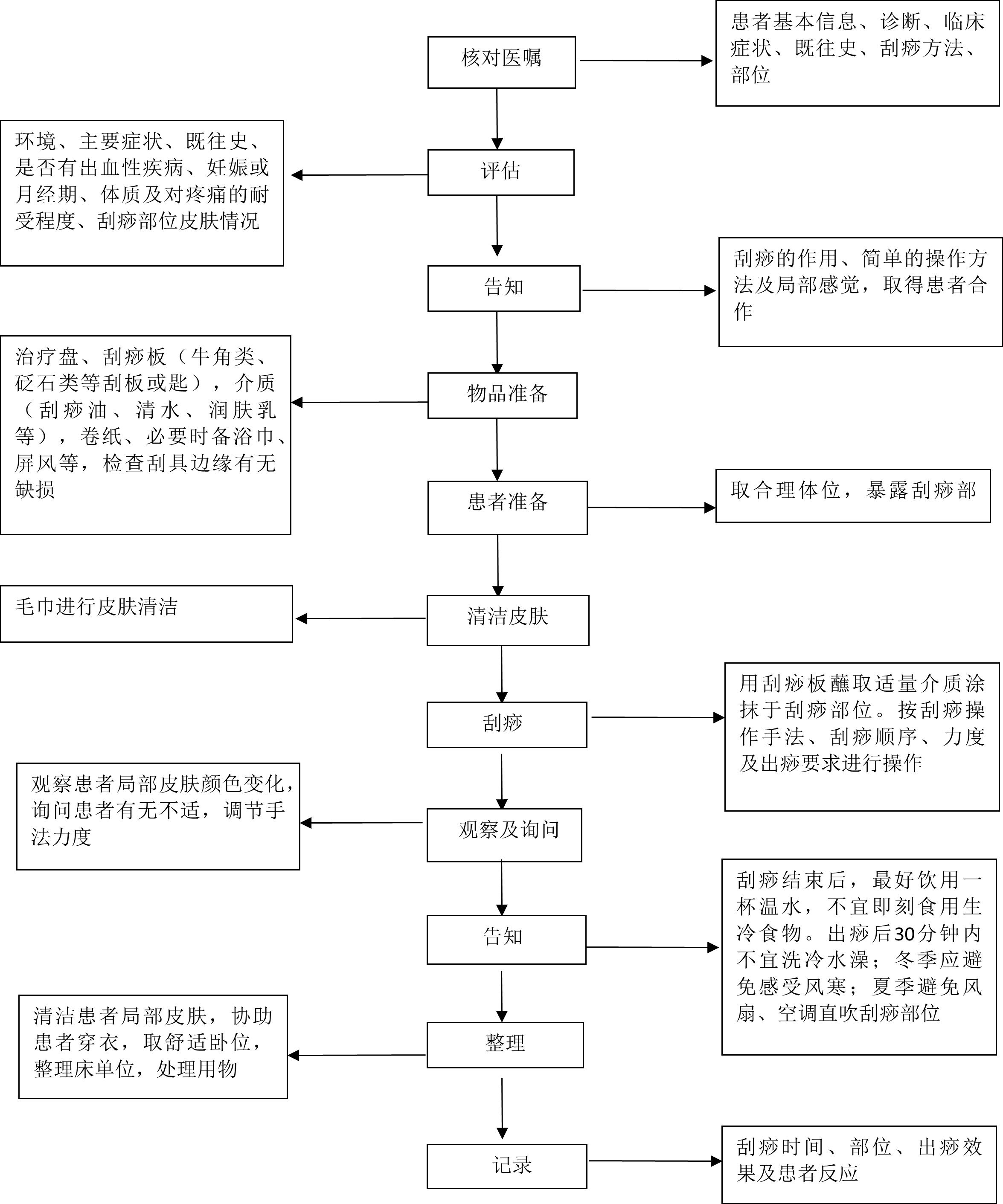 (中国中医科学院西苑医院) 附1: 常用刮痧手法 1.轻刮法 刮痧板接触皮肤下压刮拭的力量小,被刮者无疼痛及其他不适感。轻刮后皮肤仅出现微红,无瘀斑。本法宜用于老年体弱者、疼痛敏感部位及虚证的患者。 2.重刮法 刮痧板接触皮肤下压刮拭的力量较大,以患者能承受为度。本法宜用于腰背部脊柱两侧、下肢软组织较丰富处、青壮年体质较强及实证、热证、痛症患者。 3.快刮法 刮拭的频率在每分钟30次以上。此法宜用于体质强壮者,主要用于刮拭背部、四肢,以及辨证属于急性、外感病证的患者。 4.慢刮法 刮拭的频率在每分钟30次以内。本法主要用于刮拭头面部、胸部、下肢内侧等部位,以及辨证属于内科、体虚的慢性的患者。 5.直线刮法 又称直板刮法。用刮痧板在人体体表进行有一定长度的直线刮拭。本法宜用于身体比较平坦的部位,如背部、胸腹部、四肢部位。 6.弧线刮法 刮拭方向呈弧线形,刮拭后体表出现弧线形的痧痕,操作时刮痧方向多循肌肉走行或根据骨骼结构特点而定。本法宜用于胸背部肋间隙、肩关节和膝关节周围等部位。 7.摩擦法 将刮痧板与皮肤直接紧贴,或隔衣布进行有规律的旋转移动,或直线式往返移动,使皮肤产生热感。此法适宜用于麻木、发亮或绵绵隐痛的部位,如肩胛内侧、腰部和腹部;也可用于刮痧前,使患者放松。 8.梳刮法 使用刮痧板或刮痧梳从前额发际处,即双侧太阳穴处向后发际处做有规律的单向刮拭,如梳头状。此法适宜用于头痛、头晕、疲劳、失眠和精神紧张等病证。 9.点压法(点穴法) 用刮痧板的边角直接点压穴位,力量逐渐加重,以患者能承受为度,保持数秒后快速抬起,重复操作5~10次。此法适宜用于肌肉丰满处的穴位,或刮痧力量不能深达,或不宜直接刮拭的骨关节凹陷部位,如环跳、委中、犊鼻、水沟和背部脊柱棘突之间等。 10.按揉法 刮痧板在穴位处做点压按揉,点压后做往返或顺逆旋转。操作时刮痧板应紧贴皮肤不滑动,每分钟按揉50~100次。此法适宜用于太阳、曲池、足三里、内关、太冲、涌泉、三阴交等穴位。 11.角刮法 使用角形刮痧板或让刮痧板的棱角接触皮肤,与体表成45°角,自上而下或由里向外刮拭。此法适宜用于四肢关节、脊柱两侧、骨骼之间和肩关节周围,如风池、内关、合谷、中府等穴位。 12.边刮法 用刮痧板的长条棱边进行刮拭。此法适宜用于面积较大部位,如腹部、背部和下肢等。 附2: 刮痧技术操作流程图