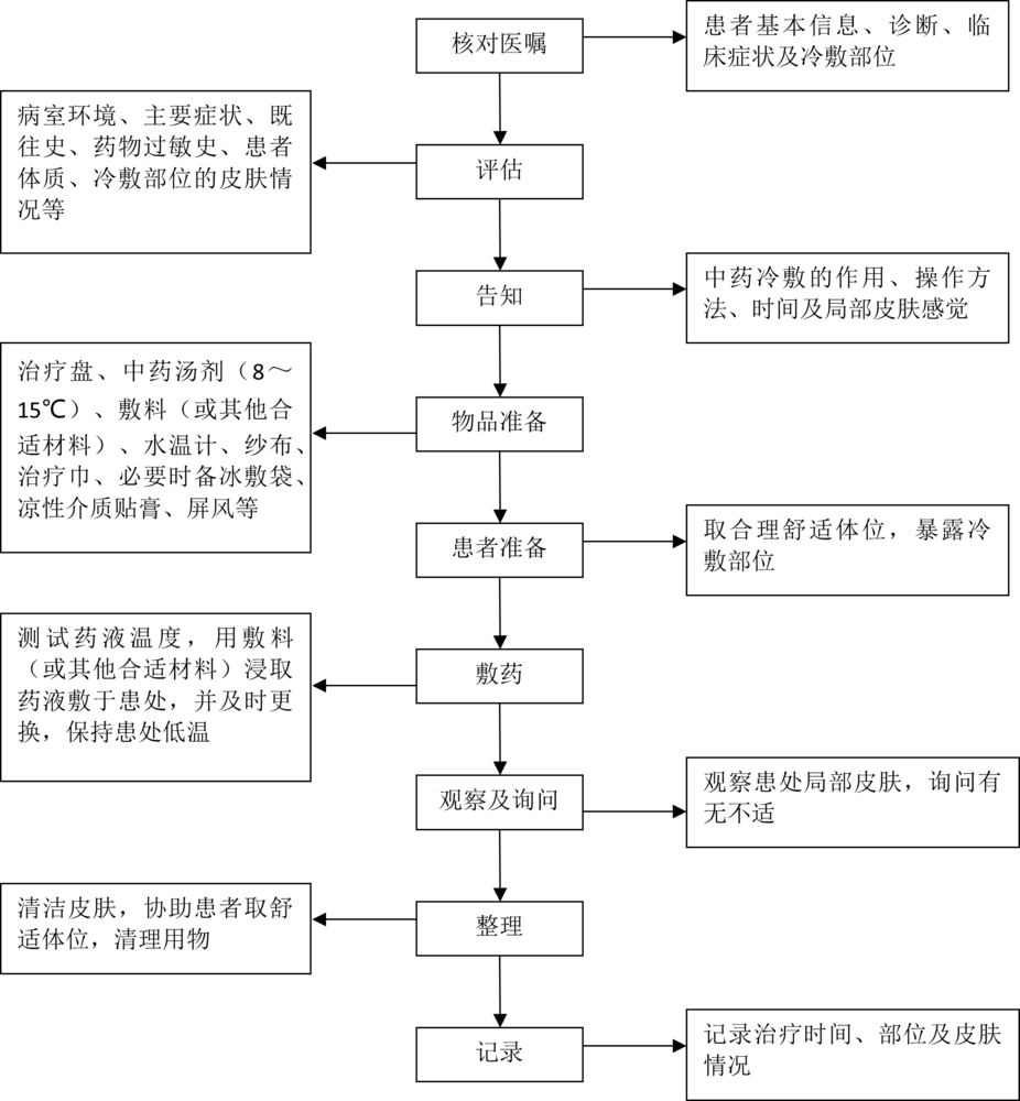 中药冷敷技术 中药冷敷技术是将中药洗剂、散剂、酊剂冷敷于患处,通过中药透皮吸收,同时应用低于皮温的物理因子刺激机体,达到降温、止痛、止血、消肿、减轻炎性渗出的一种操作方法。 一、适用范围 适用于外伤、骨折、脱位、软组织损伤的初期。 二、评估 1.病室环境,温度适宜。 2.当前主要症状、既往史及药物过敏史。 3.患者体质是否适宜中药冷敷。 4.冷敷部位的皮肤情况。 三、告知 1.冷敷时间为20~30分钟。 2.局部皮肤出现不适时,及时告知护士。 3.中药可致皮肤着色,数日后可自行消退。 四、物品准备 治疗盘、中药汤剂(8~15℃)、敷料(或其他合适材料)、水温计、纱布、治疗巾,必要时备冰敷袋、凉性介质贴膏、屏风等。 五、基本操作方法 1.核对医嘱,评估患者,做好解释。 2.备齐用物,携至床旁。协助患者取合理、舒适体位,暴露冷敷部位。 3.测试药液温度,用敷料(或其他合适材料)浸取药液,外敷患处,并及时更换(每隔5分钟重新操作一次,持续20~30分钟),保持患处低温。 4.观察患者皮肤情况,询问有无不适感。 5.其他湿冷敷方法 (1)中药冰敷 将中药散剂敷于患处,面积大于病变部位1~2cm。敷料覆盖,将冰敷袋放置于敷料上保持低温。 (2)中药酊剂凉涂法 将中药喷剂喷涂于患处,喷2~3遍,面积大于病变部位1~2cm。敷料覆盖,将冰敷袋放置于敷料上保持低温。 (3)中药散剂冷敷法 将中药粉剂揉于患处或均匀撒在有凉性物理介质的膏贴上,敷于患处,面积大于病变部位1~2cm,保留膏贴1小时。 6、操作完毕,清洁皮肤,协助患者取舒适卧位。 六、注意事项 1.阴寒证及皮肤感觉减退的患者不宜冷敷。 2.操作过程中观察皮肤变化,特别是创伤靠近关节、皮下脂肪少的患者,注意观察患肢末梢血运,定时询问患者局部感受。如发现皮肤苍白、青紫,应停止冷敷。 3.冰袋不能与皮肤直接接触。 4.注意保暖,必要时遮挡保护患者隐私。 附:中药冷敷技术操作流程图 (河南省中医药研究院附属医院) 附: 中药冷敷技术操作流程图